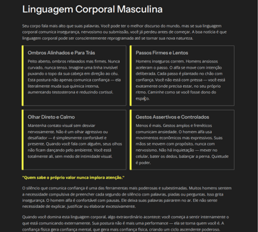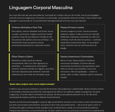 Você sabe que nasceu para ser mais. Existe uma potência masculina dentro de você — mas ela está adormecida, abafada pela rotina, por hábitos fracos e pela falta de direção. Este eBook ativa essa força interior, moldando sua confiança, postura corporal, linguagem silenciosa e presença. O que você vai aprender aqui vai mudar como o mundo te enxerga… e principalmente como você se enxerga.